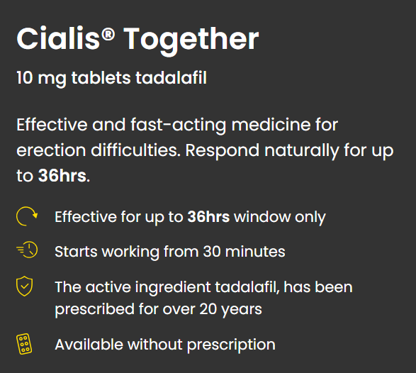 Cialis® Together 10mg tablets. For Erectile Dysfunction in adult men. Before taking Cialis® Together tablets, discuss with your pharmacist to ensure the product is suitable for you. Contains tadalafil. Always read the label.